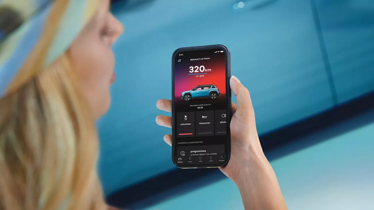 Za pomocą aplikacji My Renault można zdalnie zarządzać ładowaniem akumulatora Renault 4: programować sesje poza godzinami szczytu, monitorować stan naładowania w czasie rzeczywistym, regulować temperaturę przed wyruszeniem w drogę i lokalizować punkty ładowania. Korzystaj z usług online i monitoruj przeglądy techniczne w celu uproszczenia użytkowania samochodu w 100% elektrycznego.